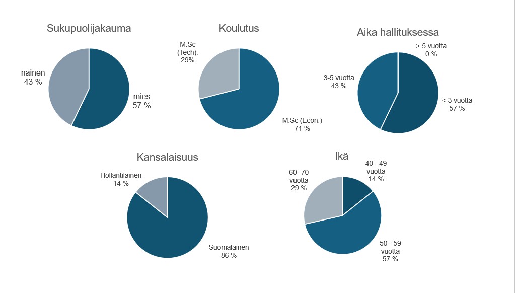 Hallituksessa on edustettuna naisia ja miehiä tasapuolisesti. Viisi hallituksen jäsentä ovat Suomen kansalaisia ja yksi hollannin kansalainen. Toimikausi hallituksessa vaihtelee alle kolmesta vuodesta yli viiteen vuoteen.